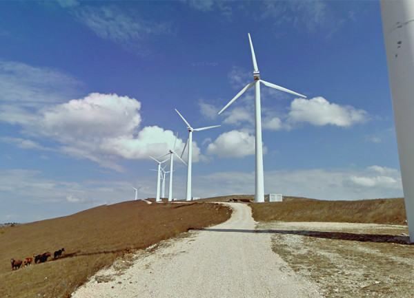 Tags: clouds | country road | horse | rural | white | wind turbine